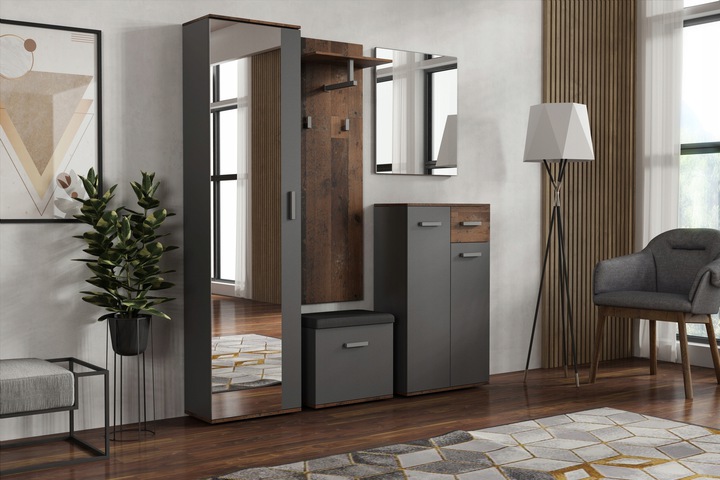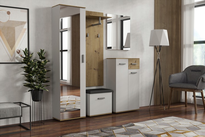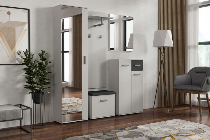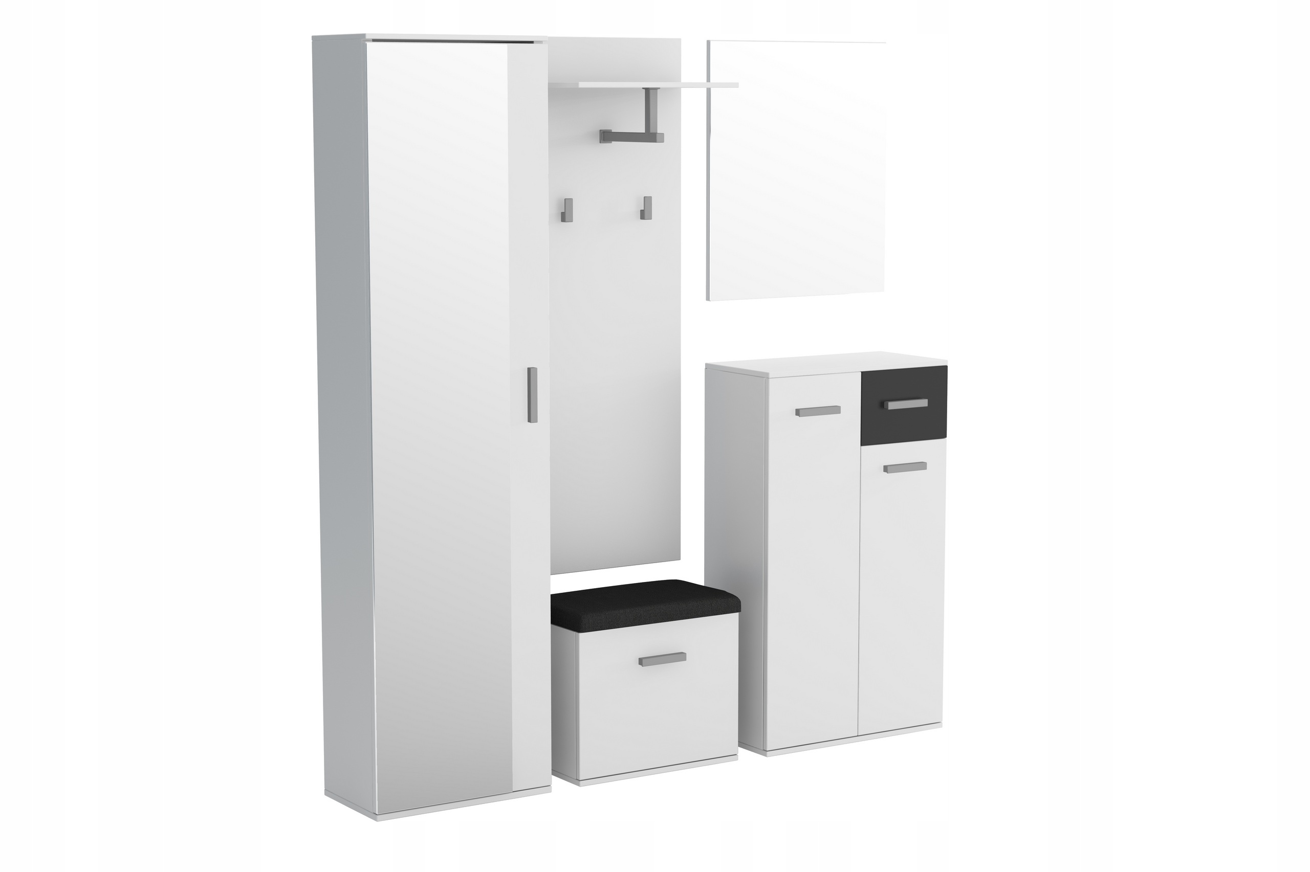 Garderoba JUSTUS dopasuje się do każdego wystroju wnętrza, białe fronty rozjaśnią mebel i dodadzą mu elegancji. W szafce są półki, które zdecydowanie ułatwią przechowywanie ubrań. Dodatkowe wieszaki są praktyczne na powieszenie odzieży wierzchniej, a szafa z półkami zapewni dodatkowe miejsce do przechowywania. W zestawie jest również komoda oraz pufa do przechowywania obuwia.