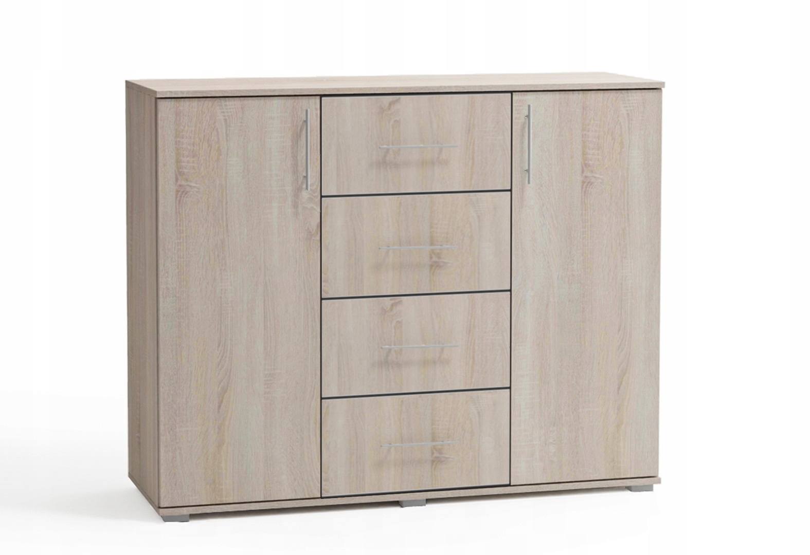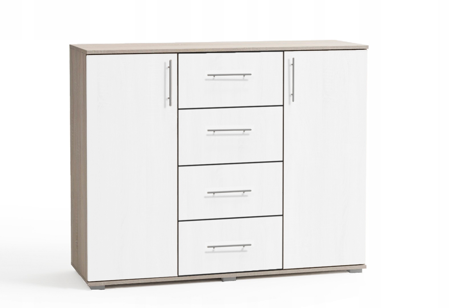 Komoda JACOB II spełni oczekiwania wszystkich ceniących sobie efektownie urządzone wnętrza, w których nowoczesność łączy się z funkcjonalnością. Wnętrze komody wypełniają cztery pojemne półki i cztery szuflady, które dają sporo miejsca do zagospodarowania i ułatwiają utrzymanie porządku. Zmieścisz w nich wiele domowych akcesoriów. Komoda będzie doskonale prezentować się jako element wyposażenia salonu, jadalni, czy sypialni. Dzięki różnorodnej kolorystyce komodę można zestawiać z wieloma innymi meblami.