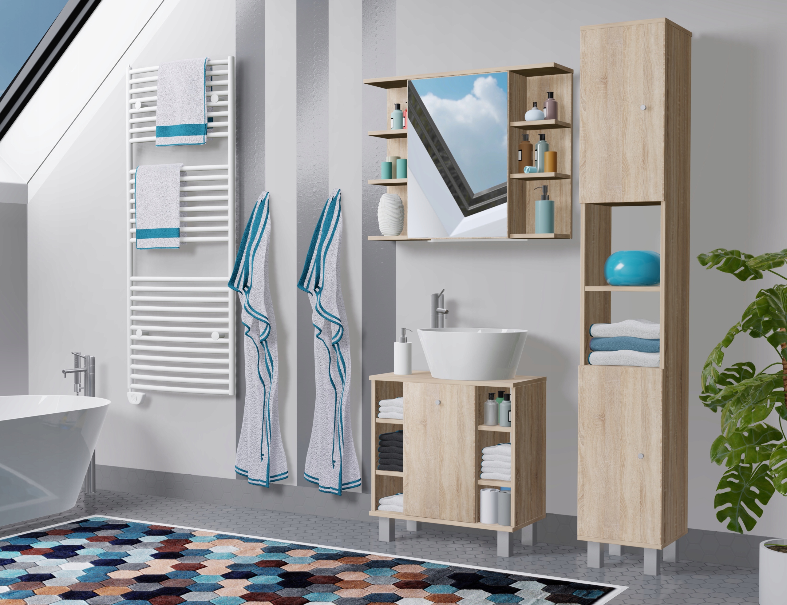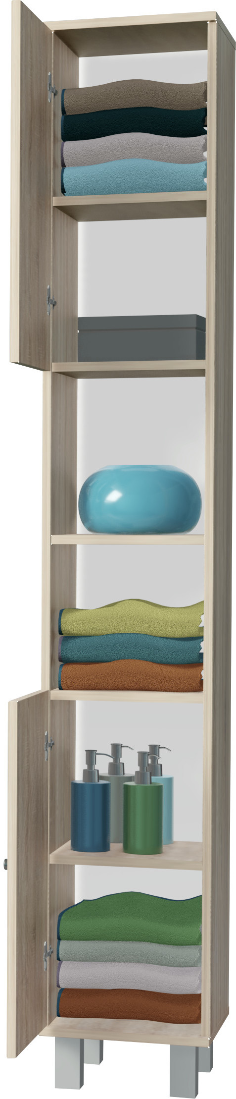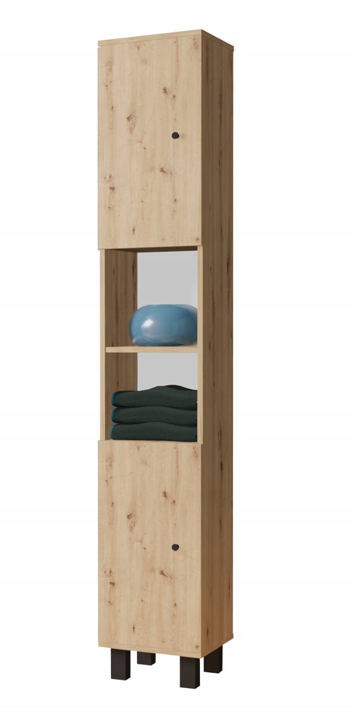 Szafka wpasuje się we wnętrze każdej łazienki. Wygodne i praktyczne półki pomieszczą wszystkie niezbędne rzeczy i kosmetyki potrzebne na co dzień. Plastikowe nóżki uniemożliwiają przypadkowe zalanie mebli. Ciekawa, a zarazem klasyczna kolorystyka wkomponuje się w styl Twojego mieszkania. Wykonana ze starannością z wysokiej jakości materiałów, co daje możliwość użytkowania przez długie lata.