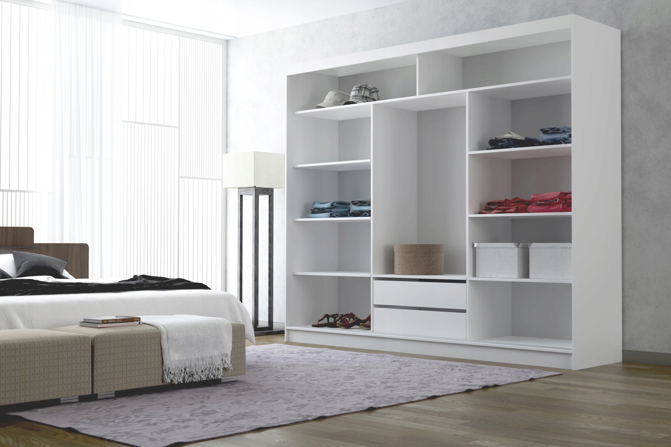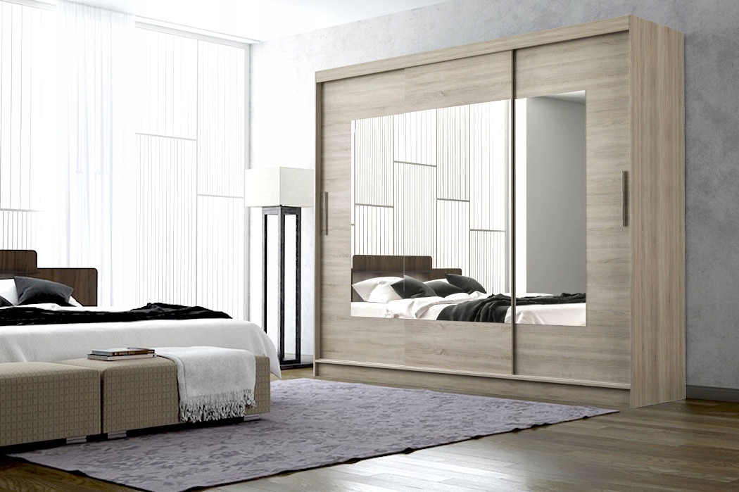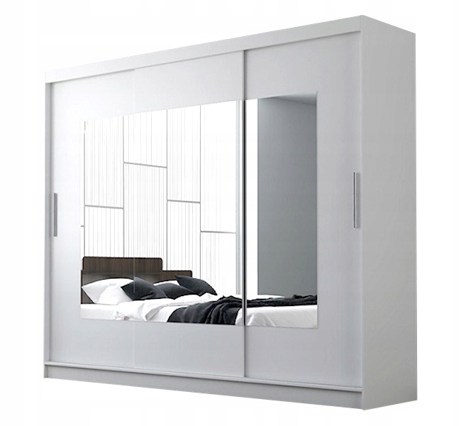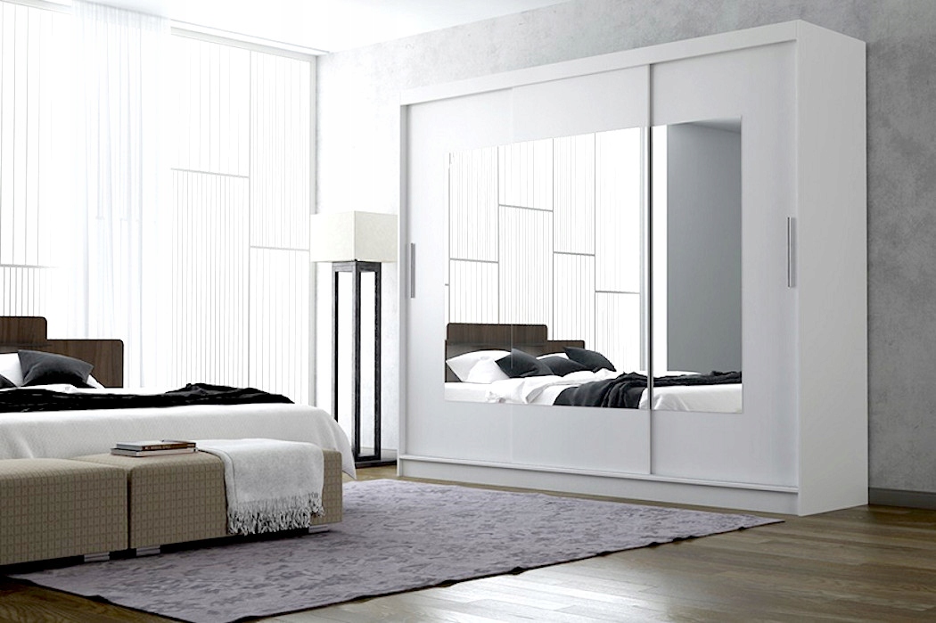 Ciekawa, a zarazem klasyczna kolorystyka wkomponuje się w styl Twojego mieszkania. Natomiast duże lustro rozjaśni i optycznie powiększy pomieszczenie. Pojemna garderoba wyposażona w półki, drążek i szuflady znacznie ułatwi przechowywanie ubrań. Wykonana ze starannością z wysokiej jakości materiałów daje pewność użytkowania przez długie lata. Kolor wnętrza szafy zawsze odpowiada frontom (na zdjęciu wnętrze szafy białej). Szafa trzydrzwiowa, wykonana z płyty wiórowo laminowanej 16mm, aluminiowy system przesuwny, oklejona obrzeżem PCV. Na drzwiach znajduję się duże lustro, w środku szafy 2 szuflady.