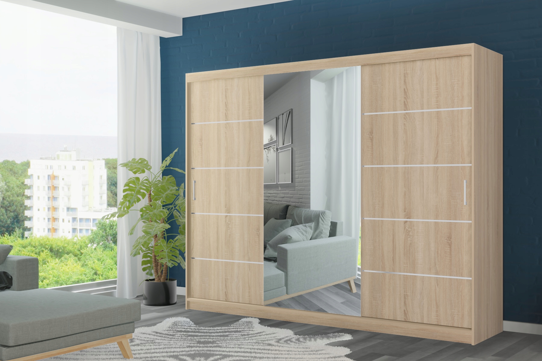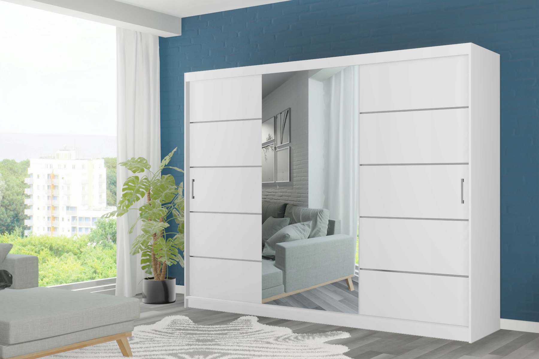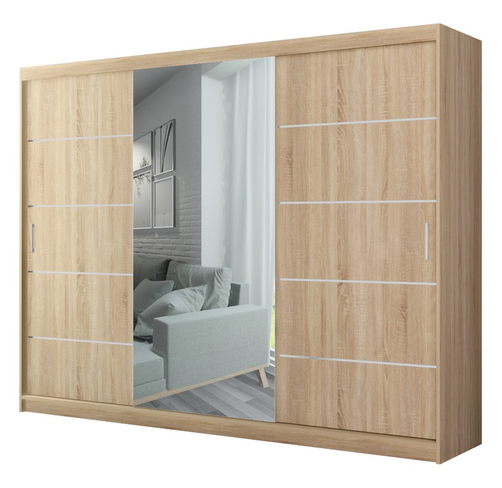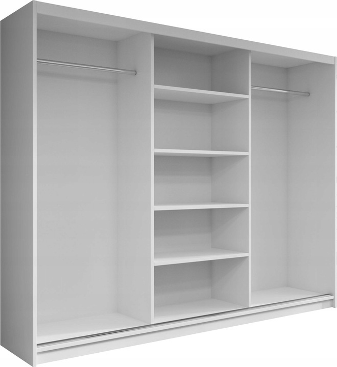 Ciekawa, a zarazem klasyczna kolorystyka wkomponuje się w styl Twojego mieszkania. Natomiast duże lustro rozjaśni i optycznie powiększy pomieszczenie. Pojemna garderoba standardowo wyposażona w 5 dodatkowych półek oraz 2 drążki znacznie ułatwi przechowywanie ubrań. Wykonana ze starannością z wysokiej jakości materiałów daje pewność użytkowania przez długie lata. Kolor wnętrza szafy zawsze odpowiada frontom (na zdjęciu wnętrze szafy białej). Szafa trzydrzwiowa, wykonana z laminowanej płyty wiórowej 16 mm, wyposażona w cichy aluminiowy system przesuwny. Na drzwiach środkowych znajduję się duże lustro, boczne drzwi wyposażone są w 4 ozdobne listwy. Szafa dostępna w paczkach do samodzielnego montażu.