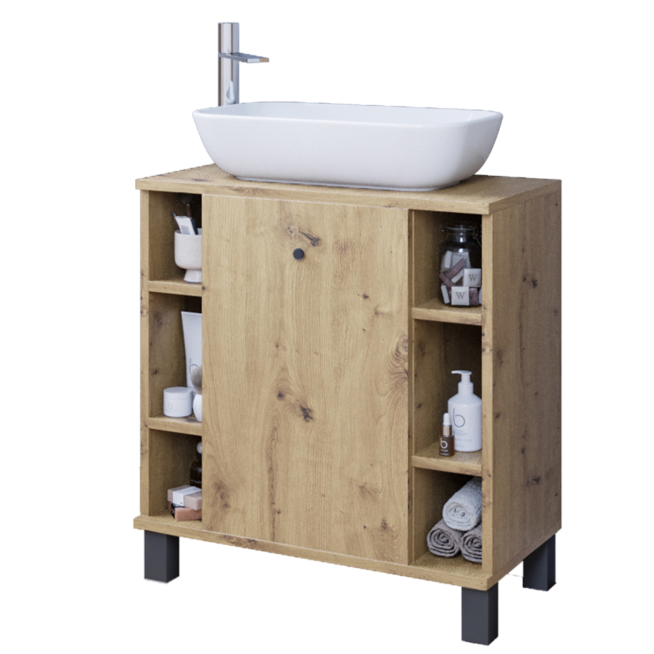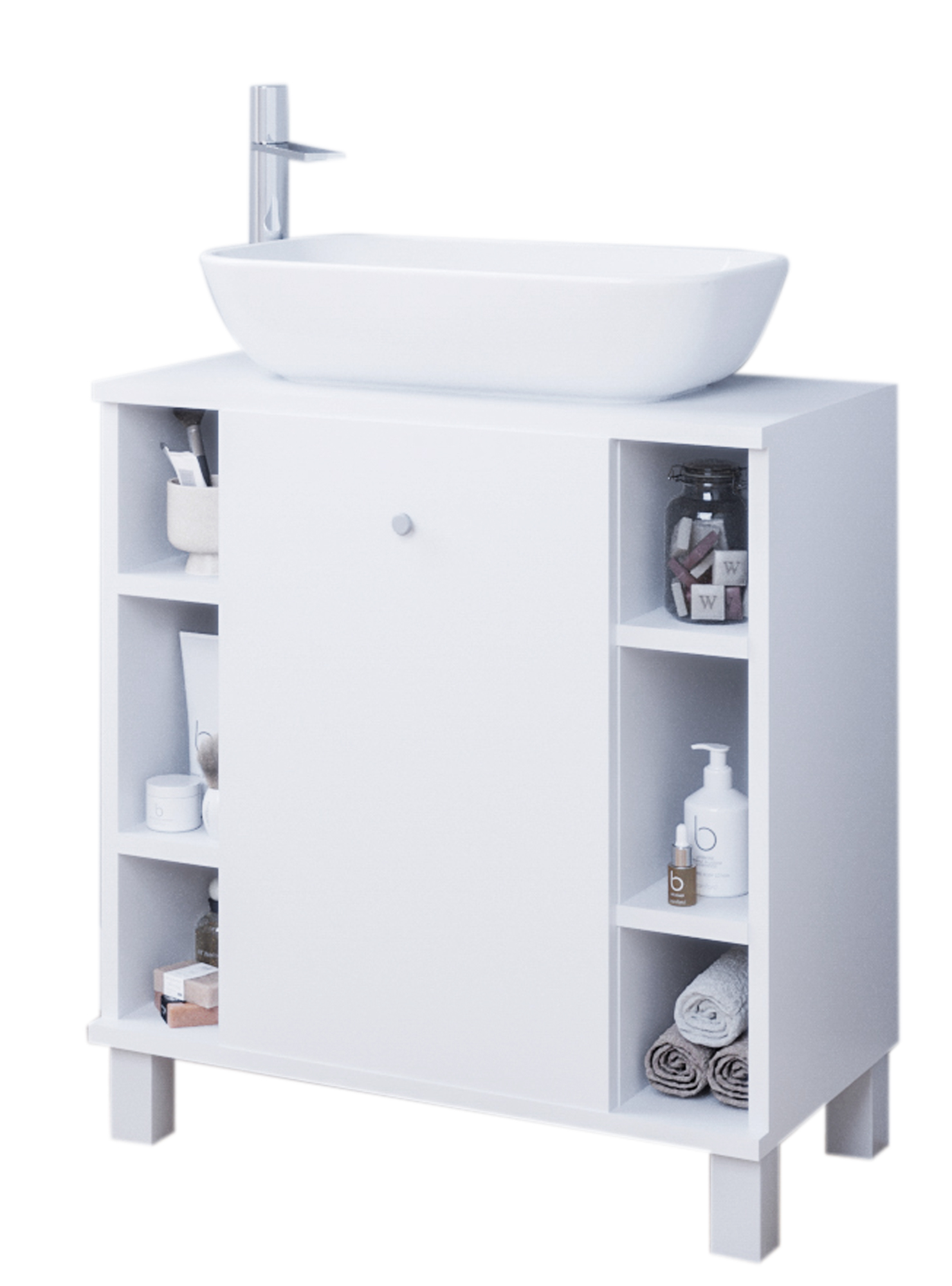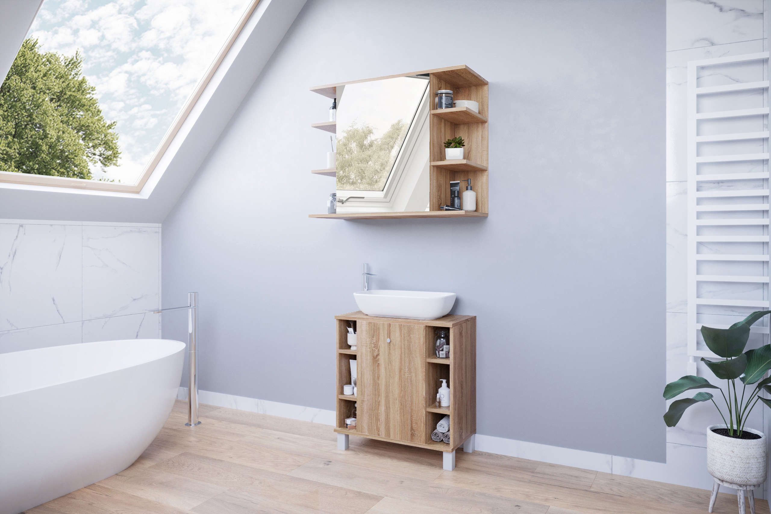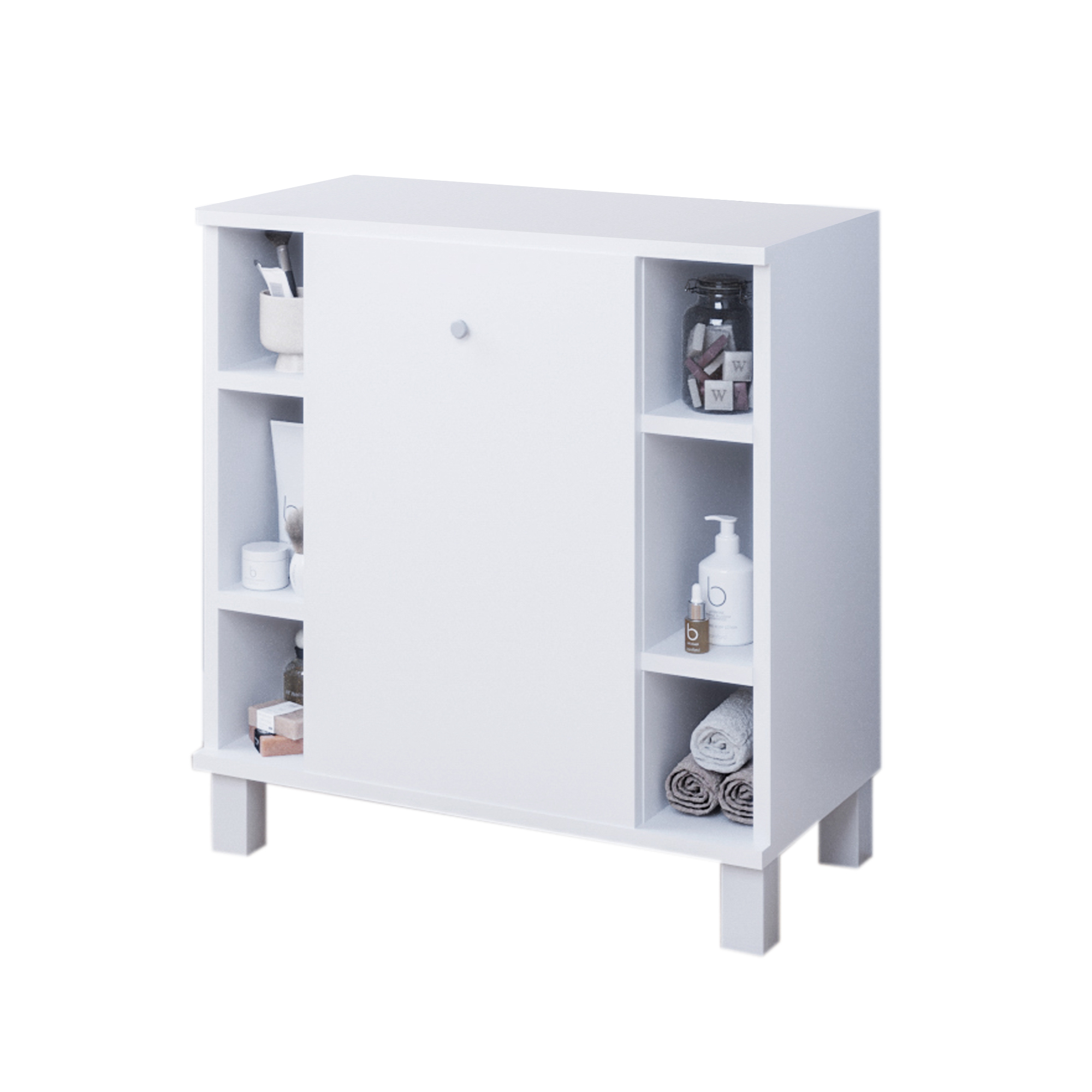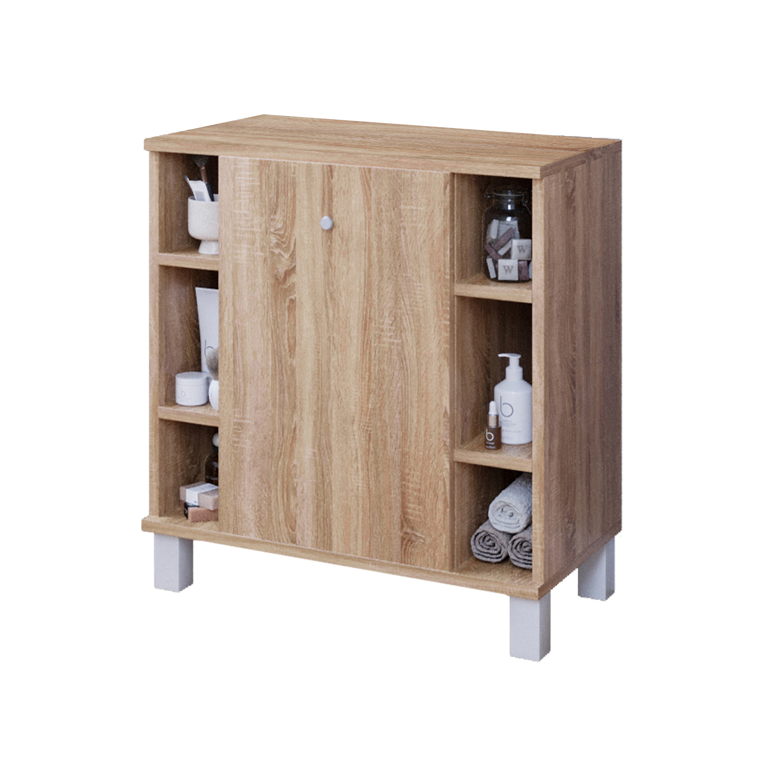 Szafka wpasuje się we wnętrze każdej łazienki. Wygodne i praktyczne półki pomieszczą wszystkie niezbędne rzeczy i kosmetyki potrzebne na co dzień. Plastikowe nóżki uniemożliwiają przypadkowe zalanie mebli. Ciekawa, a zarazem klasyczna kolorystyka wkomponuje się w styl Twojego mieszkania. Wykonana ze starannością z wysokiej jakości materiałów, co daje możliwość użytkowania przez długie lata.