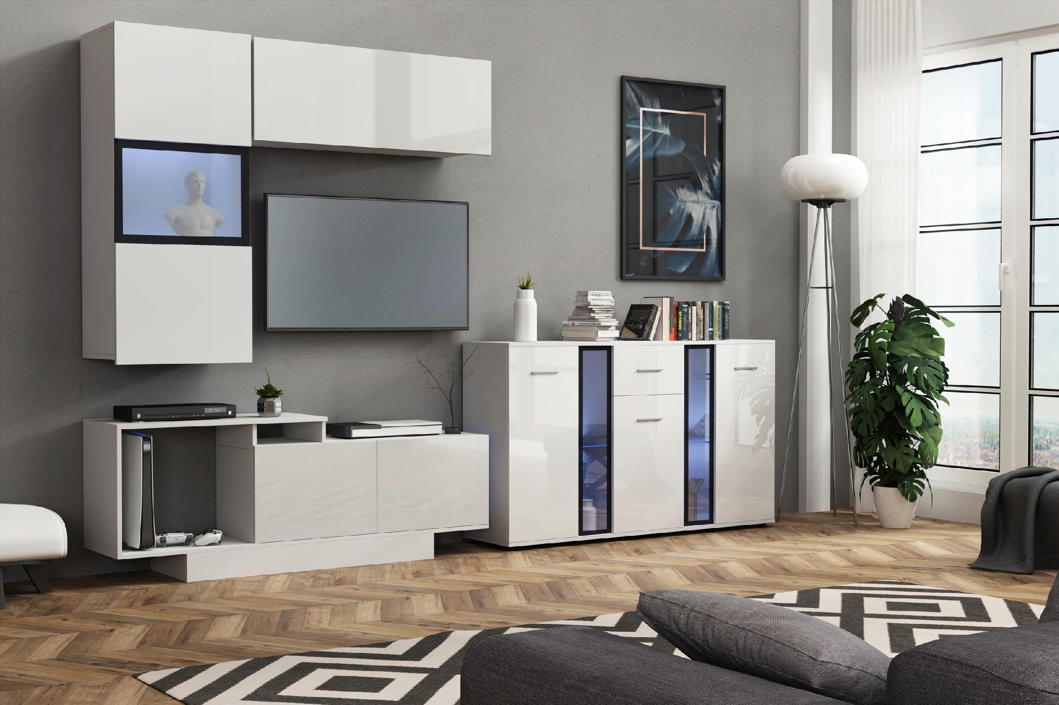 Korpus szafki wykonany jest z laminowanej płyty o grubości 16mm, front stanowi płyta wykonana w kolorze białym w połysku.