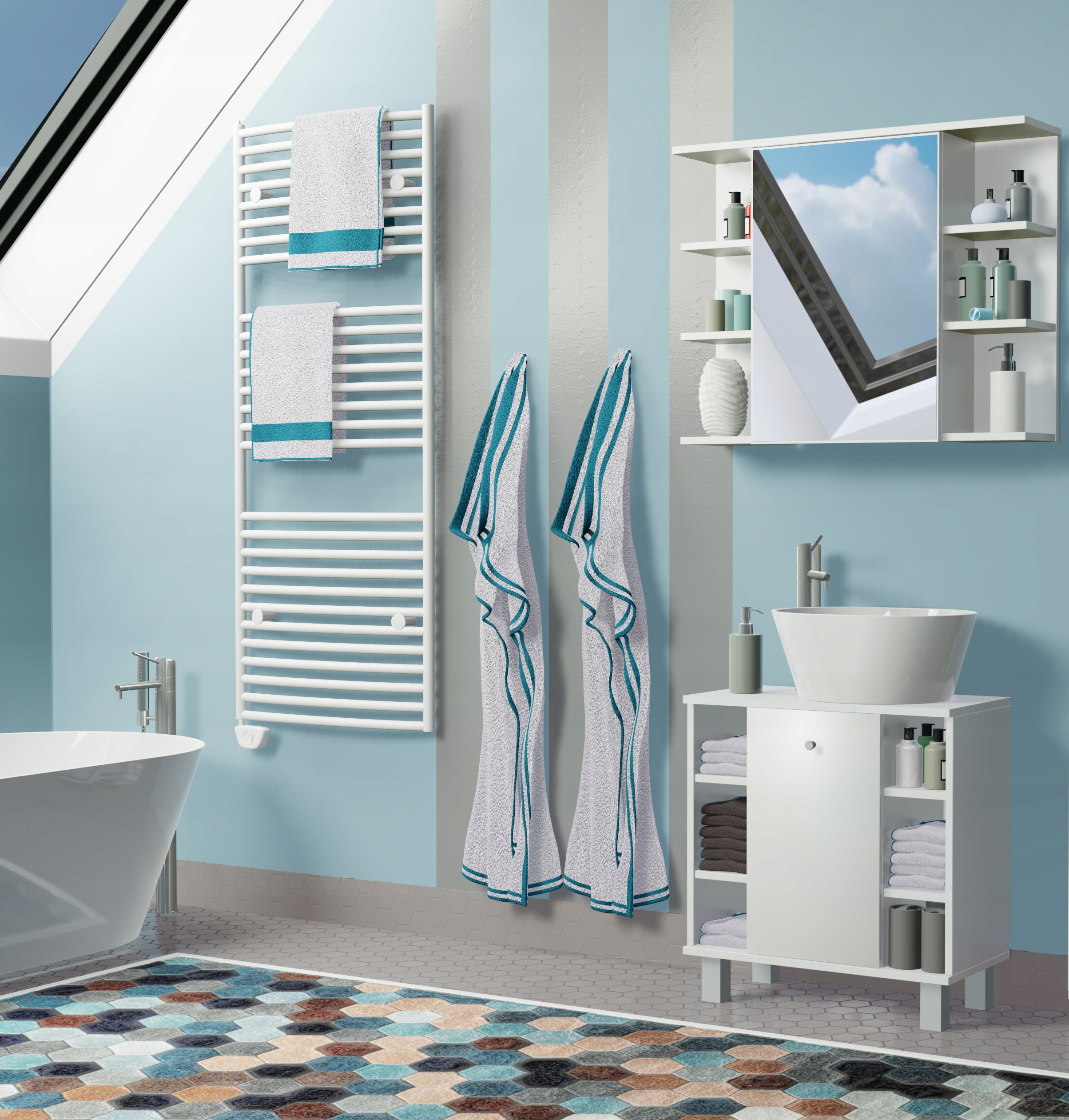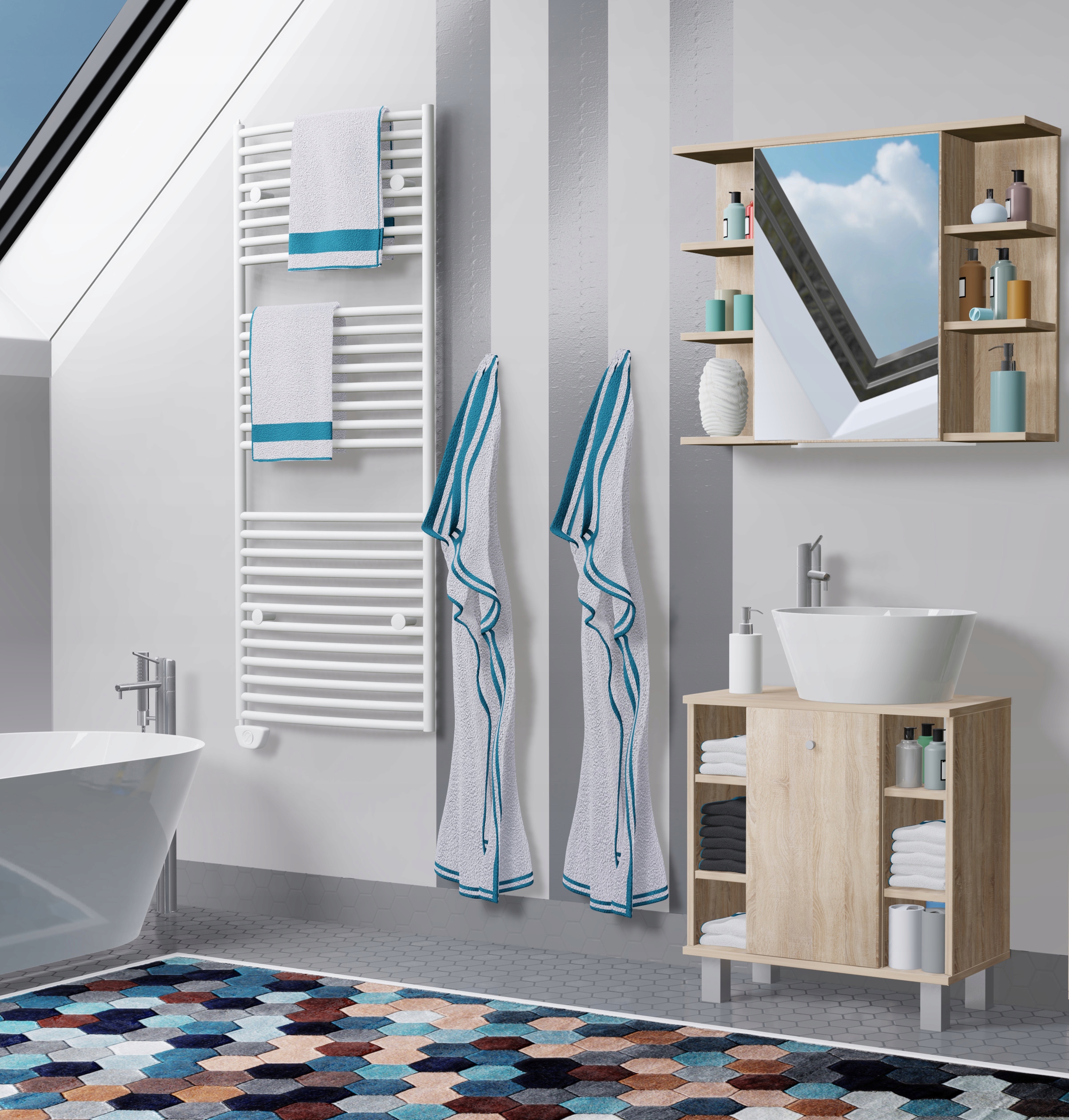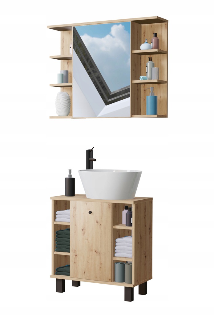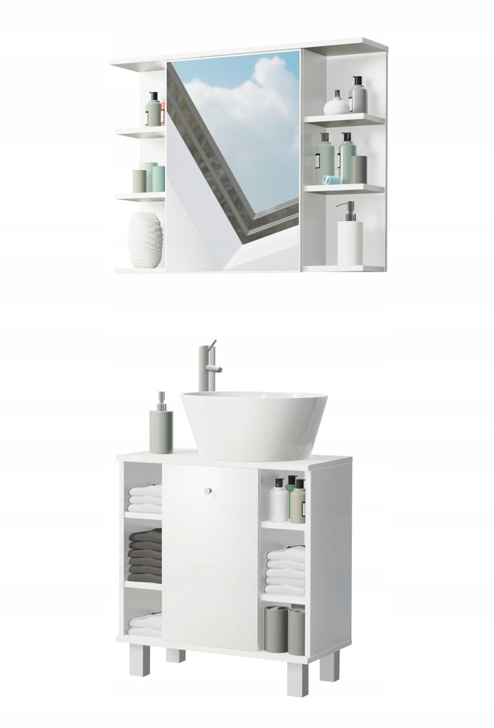 Zestaw składa się z 2 oddzielnych mebli, dzięki czemu może być dowolnie zaaranżowany i wpasuje się we wnętrze każdej łazienki. Wygodne i praktyczne półki pomieszczą wszystkie niezbędne rzeczy i kosmetyki potrzebne na co dzień. Plastikowe nóżki uniemożliwiają przypadkowe zalanie mebli. Praktyczne i duże lustro kryje za sobą dodatkowe półki, dzięki czemu można tam schować najbardziej potrzebne kosmetyki. Ciekawa, a zarazem klasyczna kolorystyka wkomponuje się w styl Twojego mieszkania. Wykonany ze starannością z wysokiej jakości materiałów, co daje możliwość użytkowania przez długie lata.