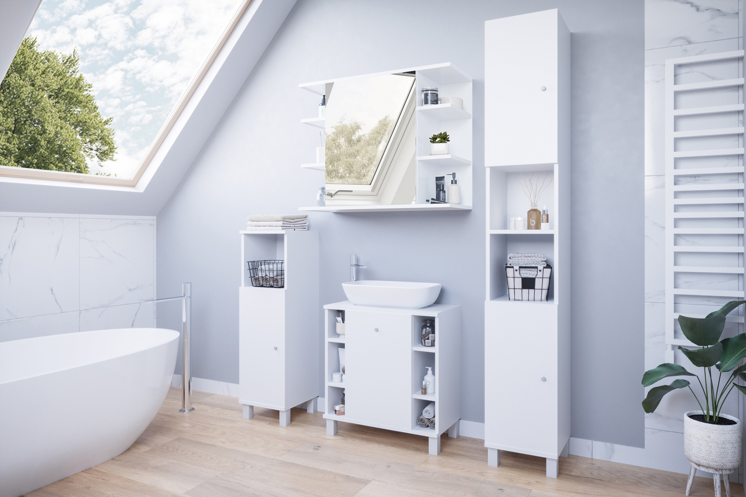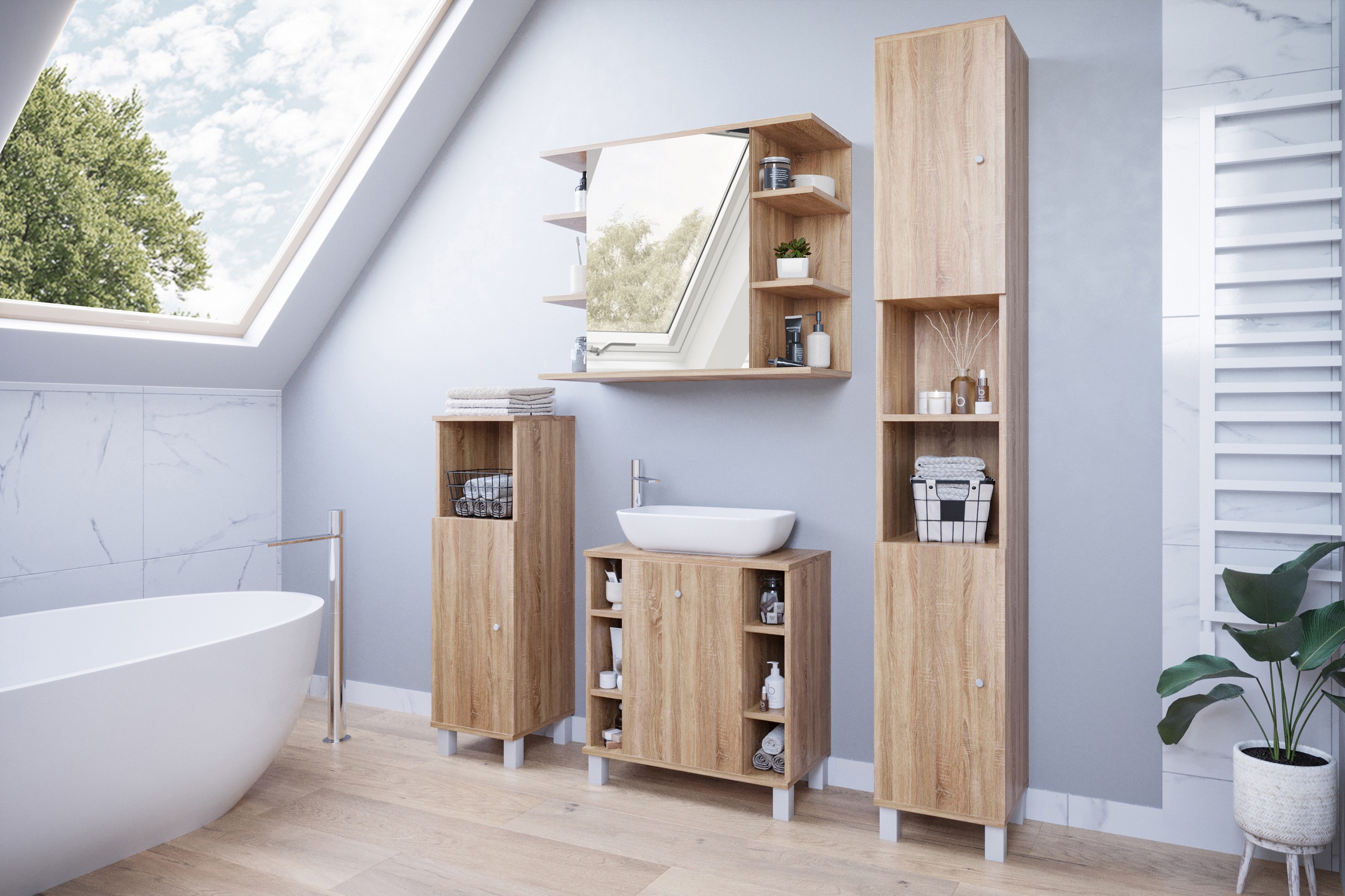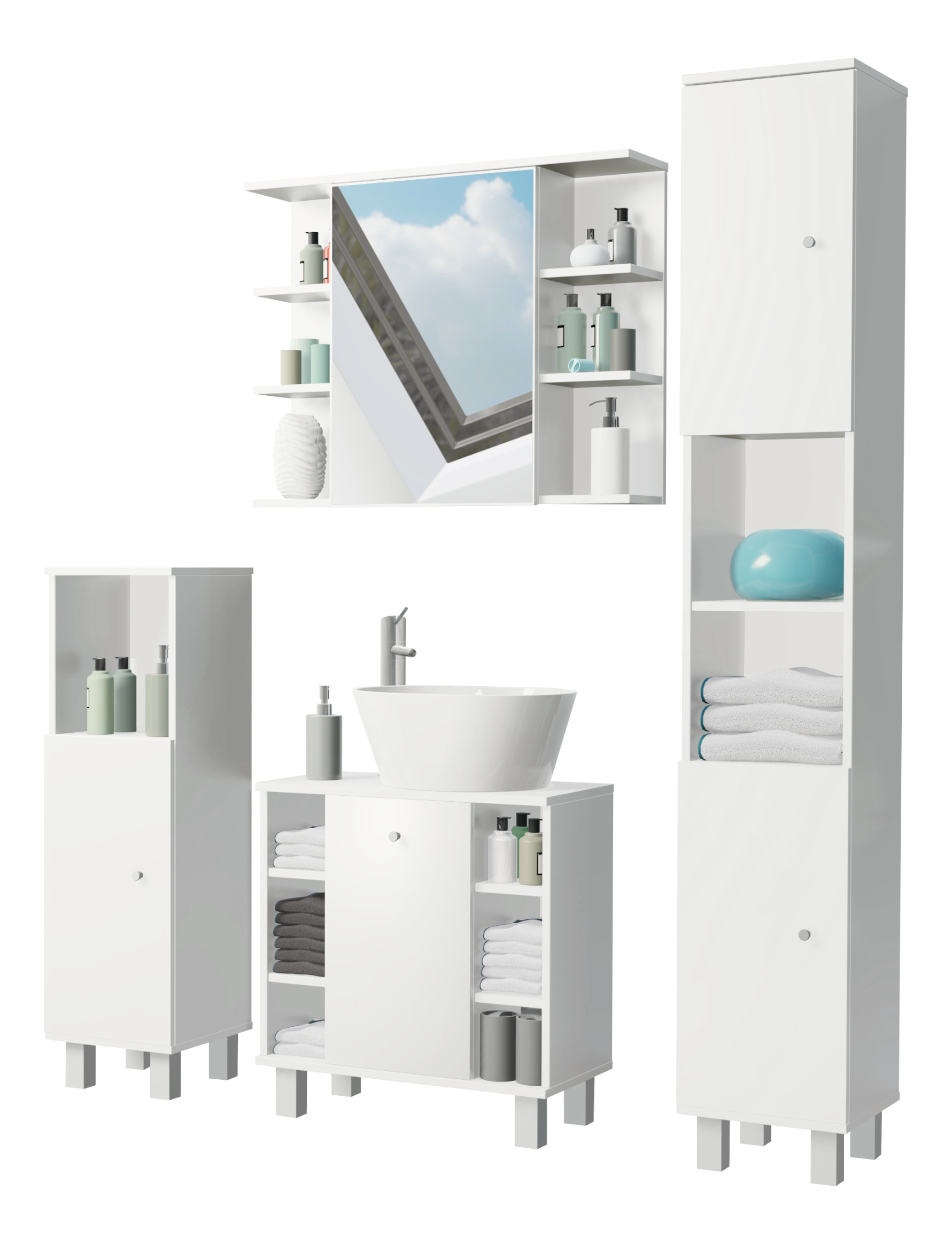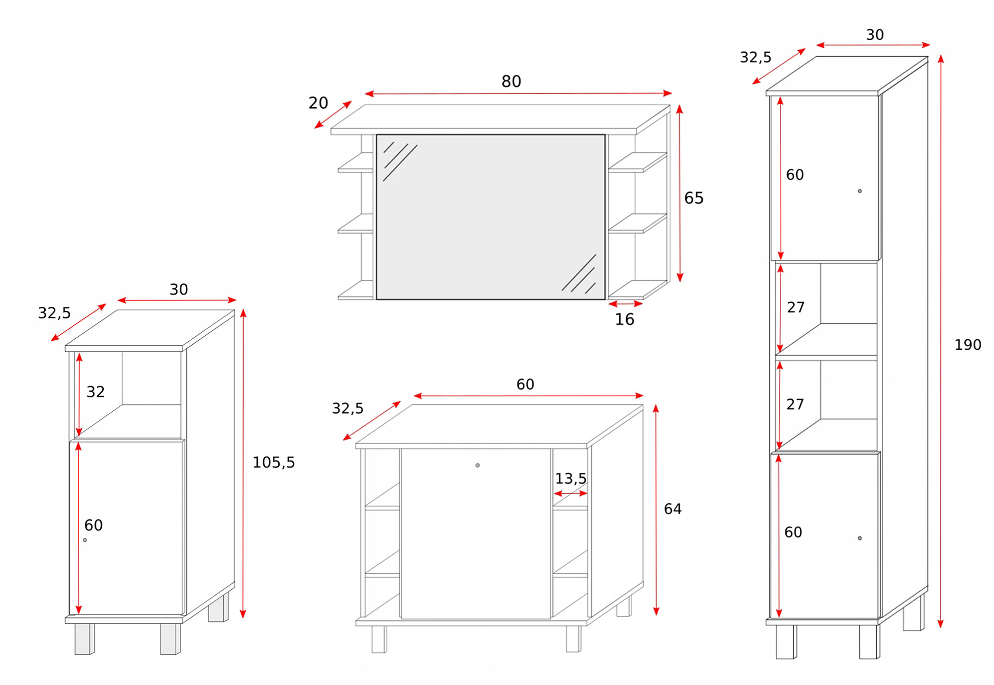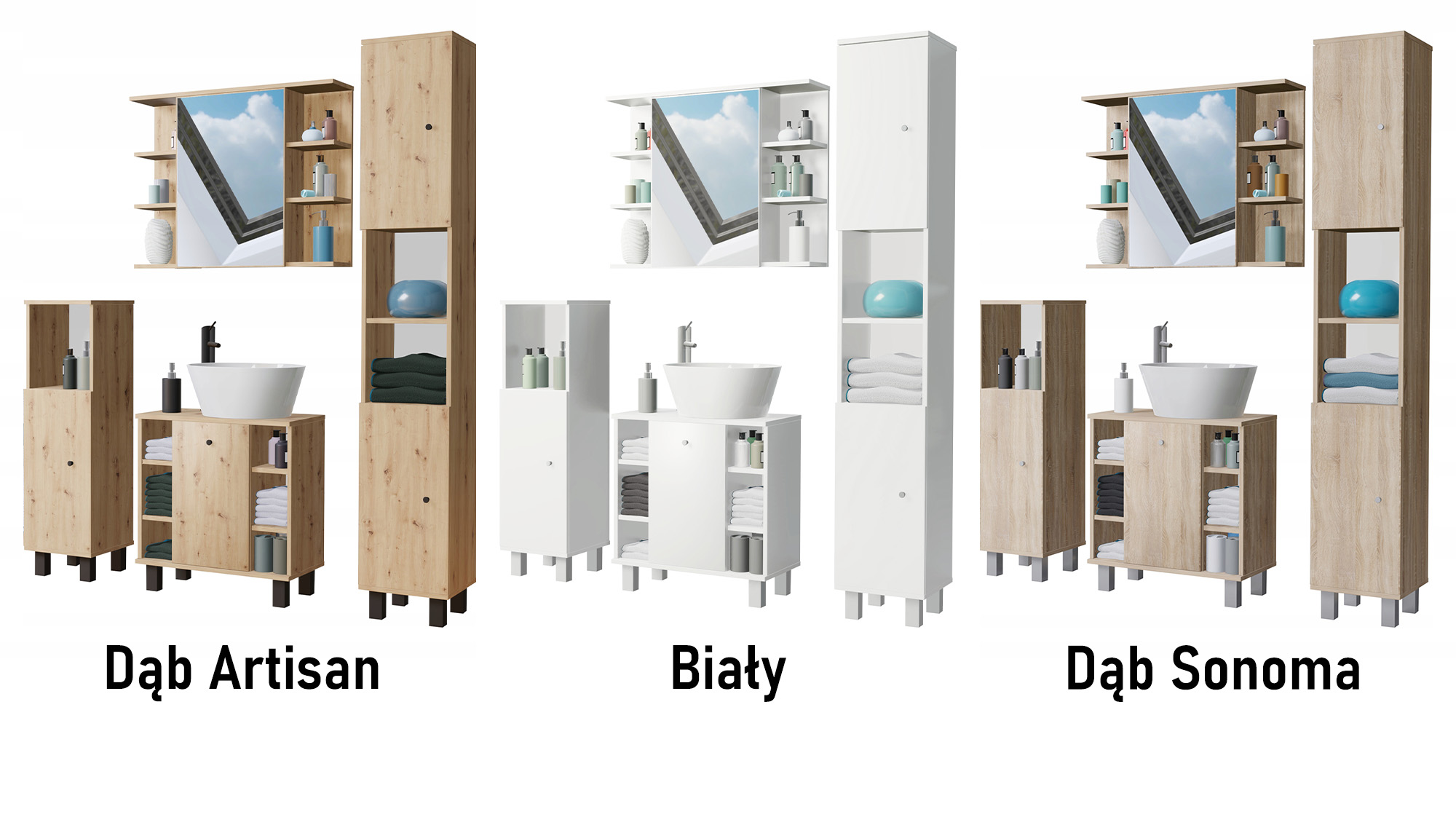 Prezentowany zestaw łazienkowy wpasuje się we wnętrze każdej łazienki. Wygodne i praktyczne półki pomieszczą wszystkie niezbędne rzeczy i kosmetyki potrzebne na co dzień. Plastikowe nóżki uniemożliwiają przypadkowe zalanie mebli. Ciekawa, a zarazem klasyczna kolorystyka wkomponuje się w styl Twojego mieszkania. Wykonany ze starannością z wysokiej jakości materiałów, co daje możliwość użytkowania przez długie lata.